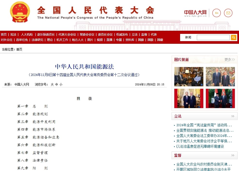11月8日,十四屆全國人大常委會第十二次會議表決通過《中華人民共和國能源法》(以下簡稱《能源法》),該法自2025年月1日起施行。