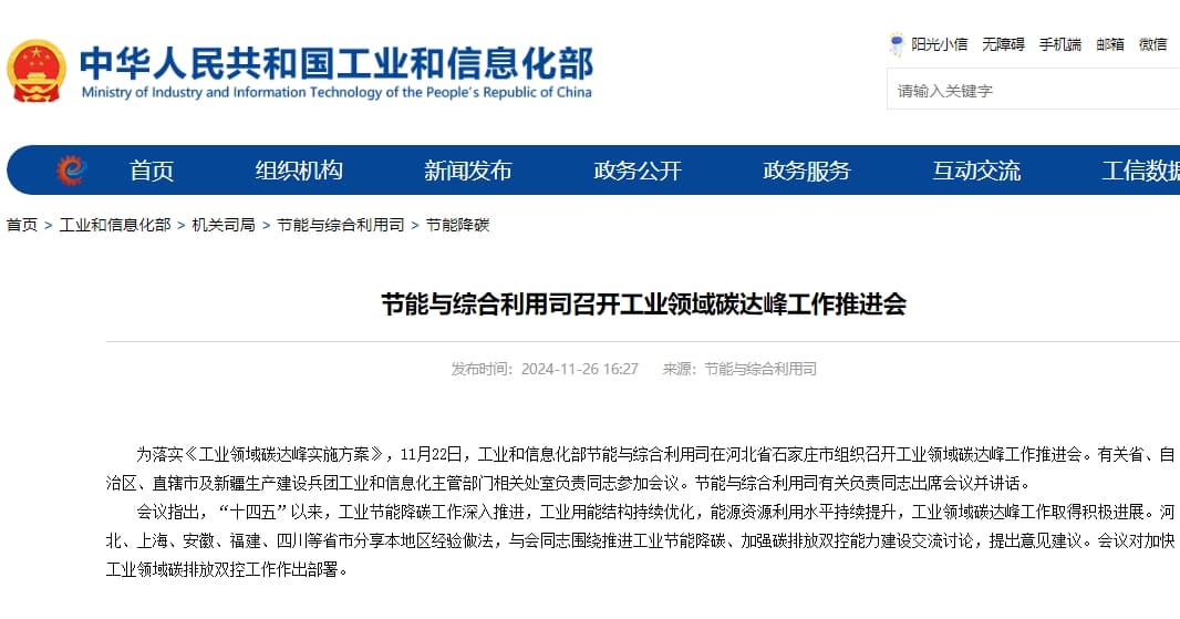11月22日,工業和信息化部節能與綜合利用司組織召開了工業領域碳達峰工作推進會。