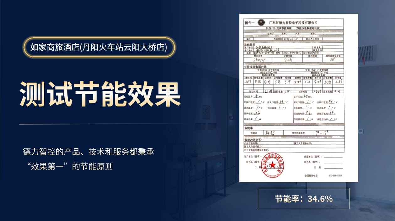 近日,德力智控為丹陽市如家商旅酒店空調設備節能改造,實地打樣節能率34.6%!
