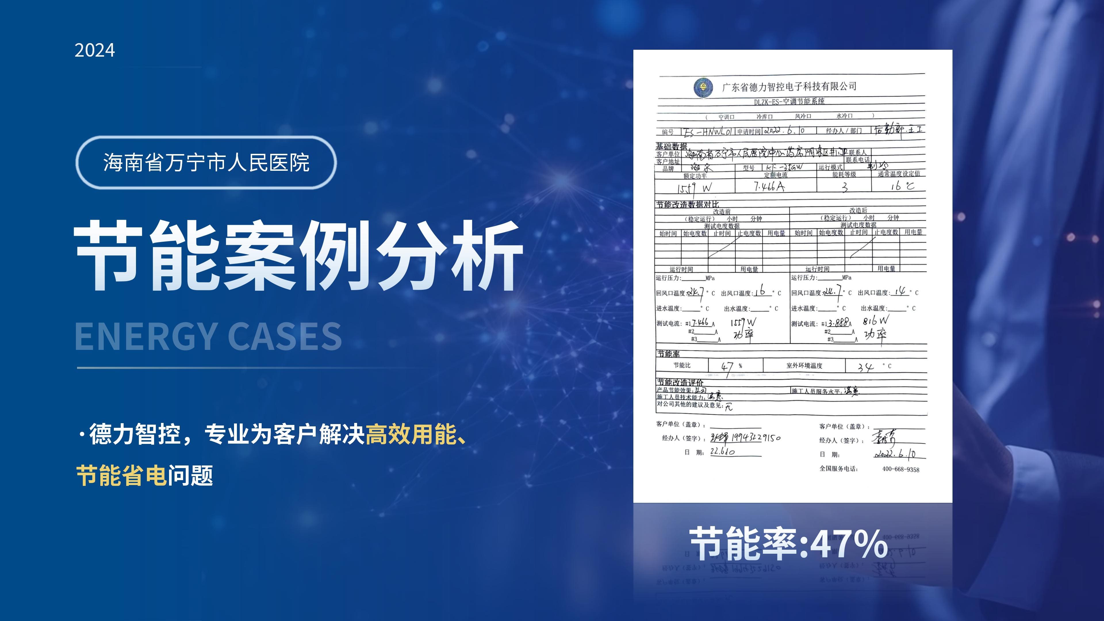德力智控就是一家專業(yè)為客戶解決高效用能、節(jié)能省電問(wèn)題,提供一站式全面節(jié)能省電服務(wù)的企業(yè)。就拿海南省萬(wàn)寧市人民醫(yī)院為例,德力智控為其空調(diào)系統(tǒng)節(jié)能改造,節(jié)能配比效果高達(dá)47%,空調(diào)直接省電近一半,獲得了院方人員的一致認(rèn)可!