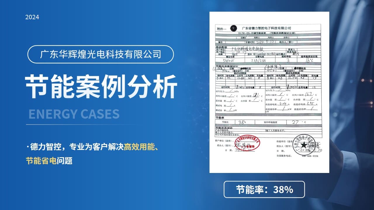 后期,專業施工人員為華輝煌光電公司嚴格打造了獨特的節能改造服務,其中一處的設備節能33%,另一處設備更是節能38%,節能省電效果非常好!