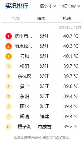 截止19日13時,全國高溫實況排行榜的前十名中,前八地皆位于浙江,“霸屏”氣溫榜!