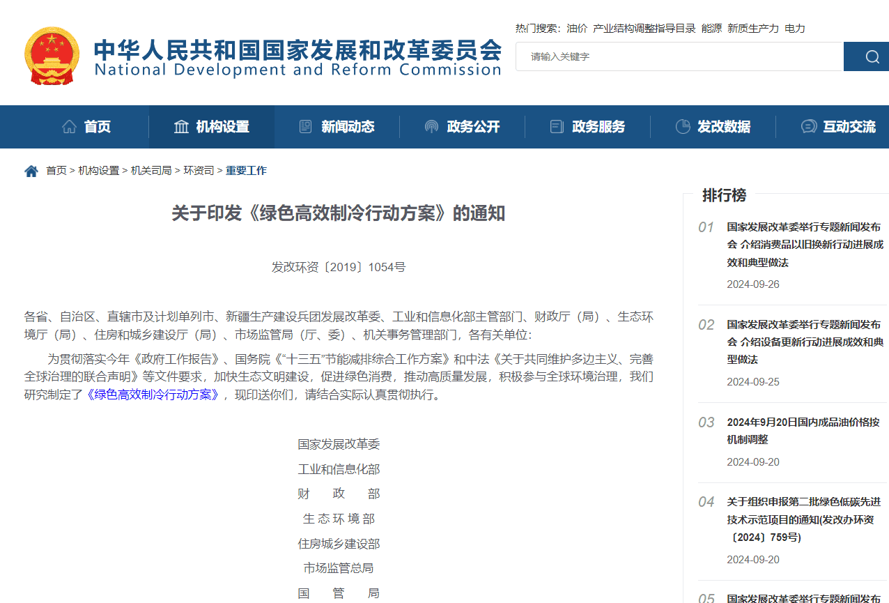 2019年,國家發改委等七部門聯合印發《綠色高效制冷行動方案》(以下簡稱:方案)。