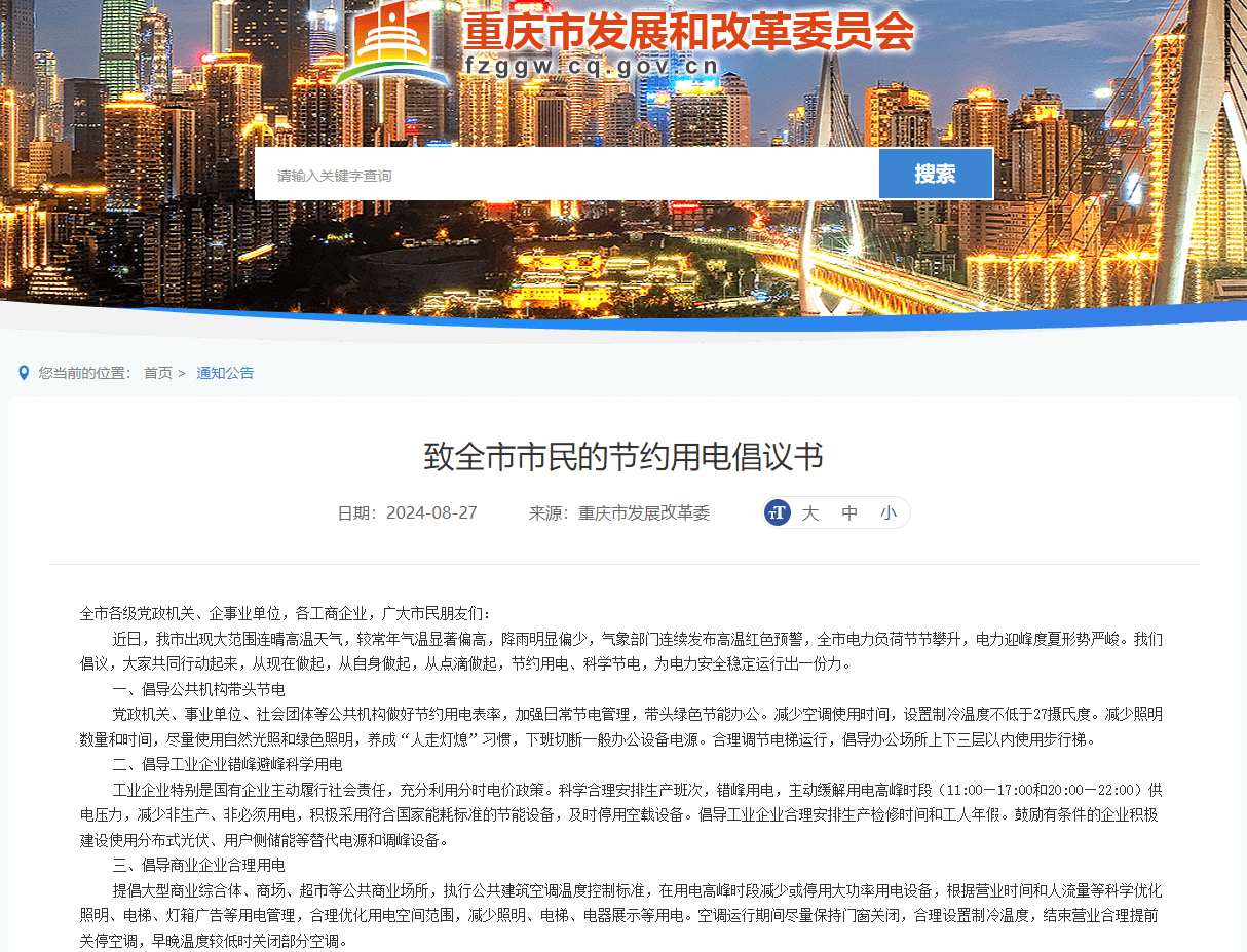 8月27日,重慶市發改委發布了《致全市市民的節約用電倡議書》,倡導公共機構帶頭節電、工業企業錯峰避峰科學用電、商業企業合理用電等,做到低碳節能,緩解供電壓力!