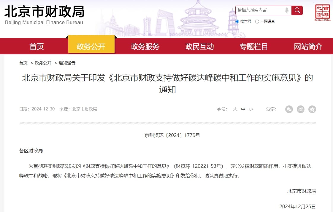 12月30日,北京市財政局正式印發了《北京市財政支持做好碳達峰碳中和工作的實施意見》(以下簡稱:實施意見)。