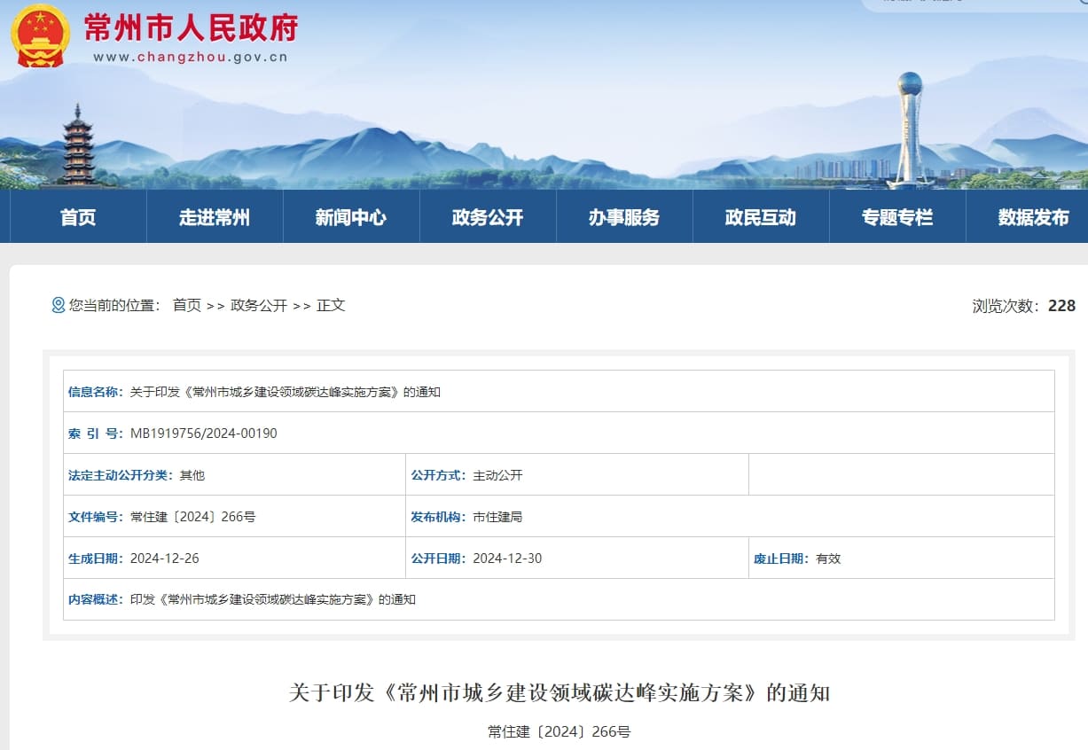 12月30日,江蘇省常州市正式印發《常州市城鄉建設領域碳達峰實施方案》(以下簡稱:實施方案)。